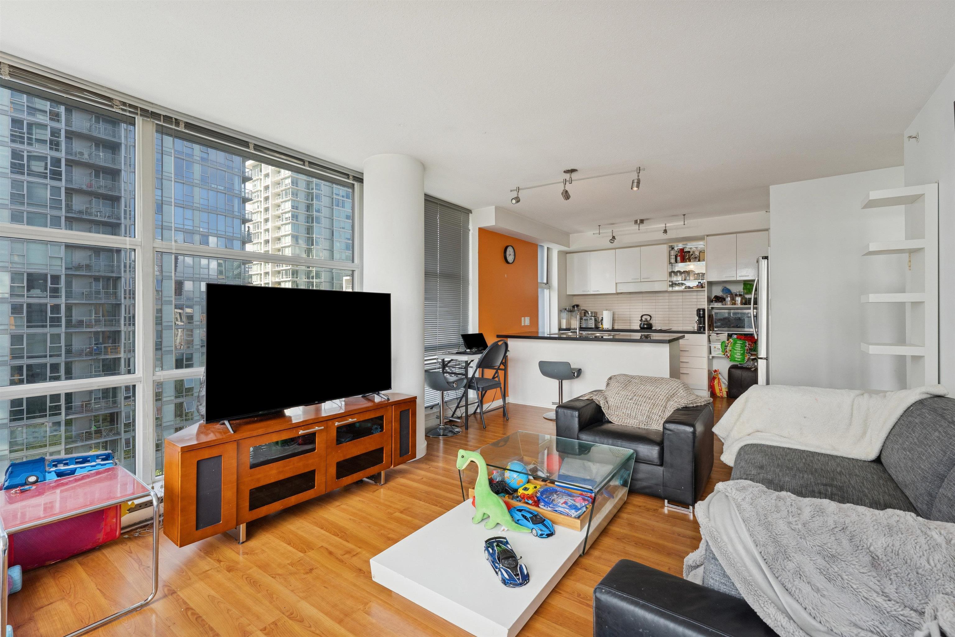 Perfect investment property or move right in! Luxury living at Spectrum 4 by Concord Pacific! This bright corner unit offers City VIEWS and a smart layout with 2 bedrooms, 1 bathroom, and a versatile FLEX. Enjoy world-class amenities at Club Ozone: an 80-ft indoor pool, whirlpool, steam/dry saunas, state-of-the-art gym, lounge, and two playgrounds surrounded by greenery. With 24-hour concierge, security and convenience are always at your fingertips. Includes 1 parking stall. Steps to SkyTrain, Costco, T&T, BC Place, International Village, theatres, and Science World.