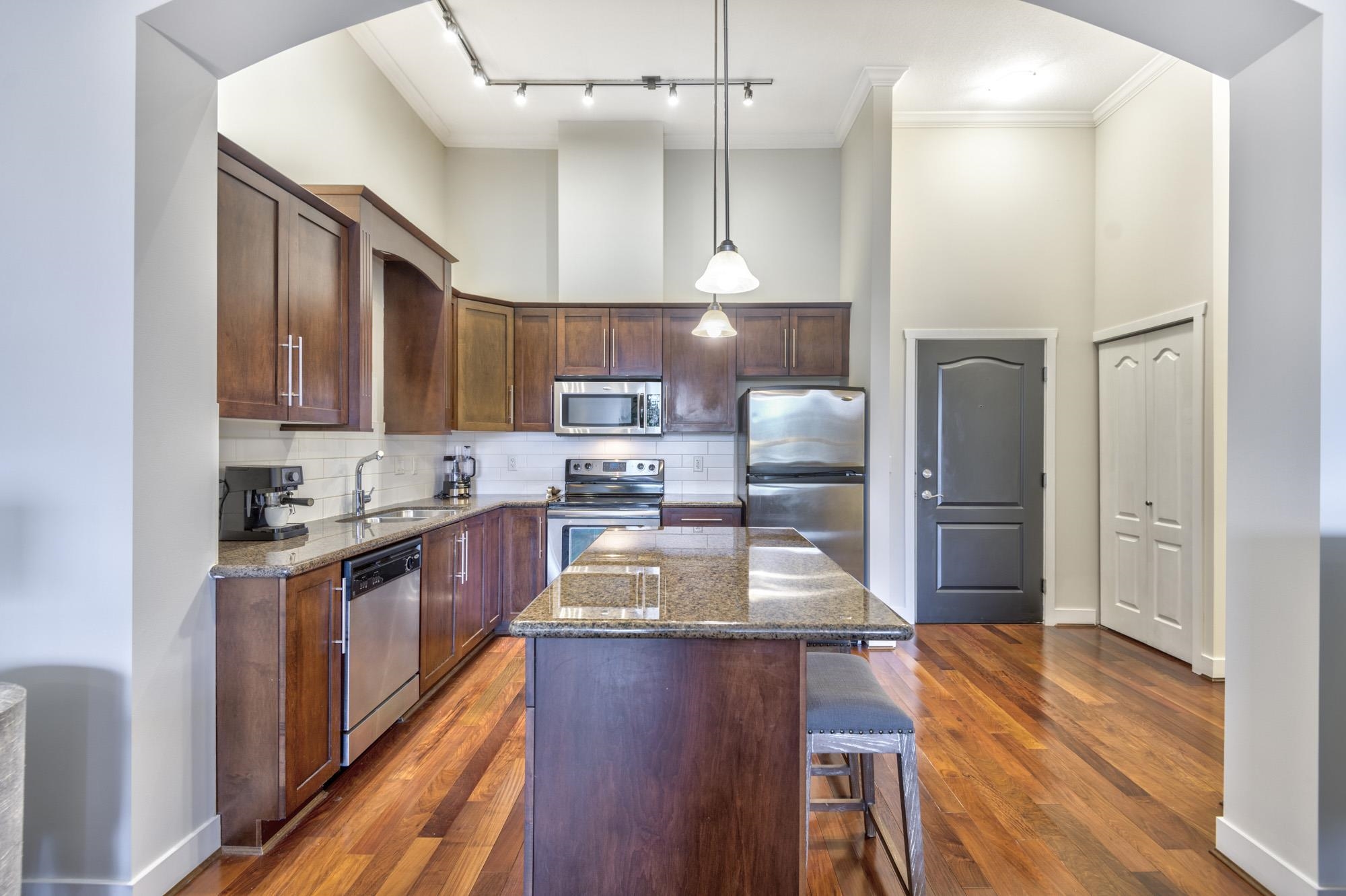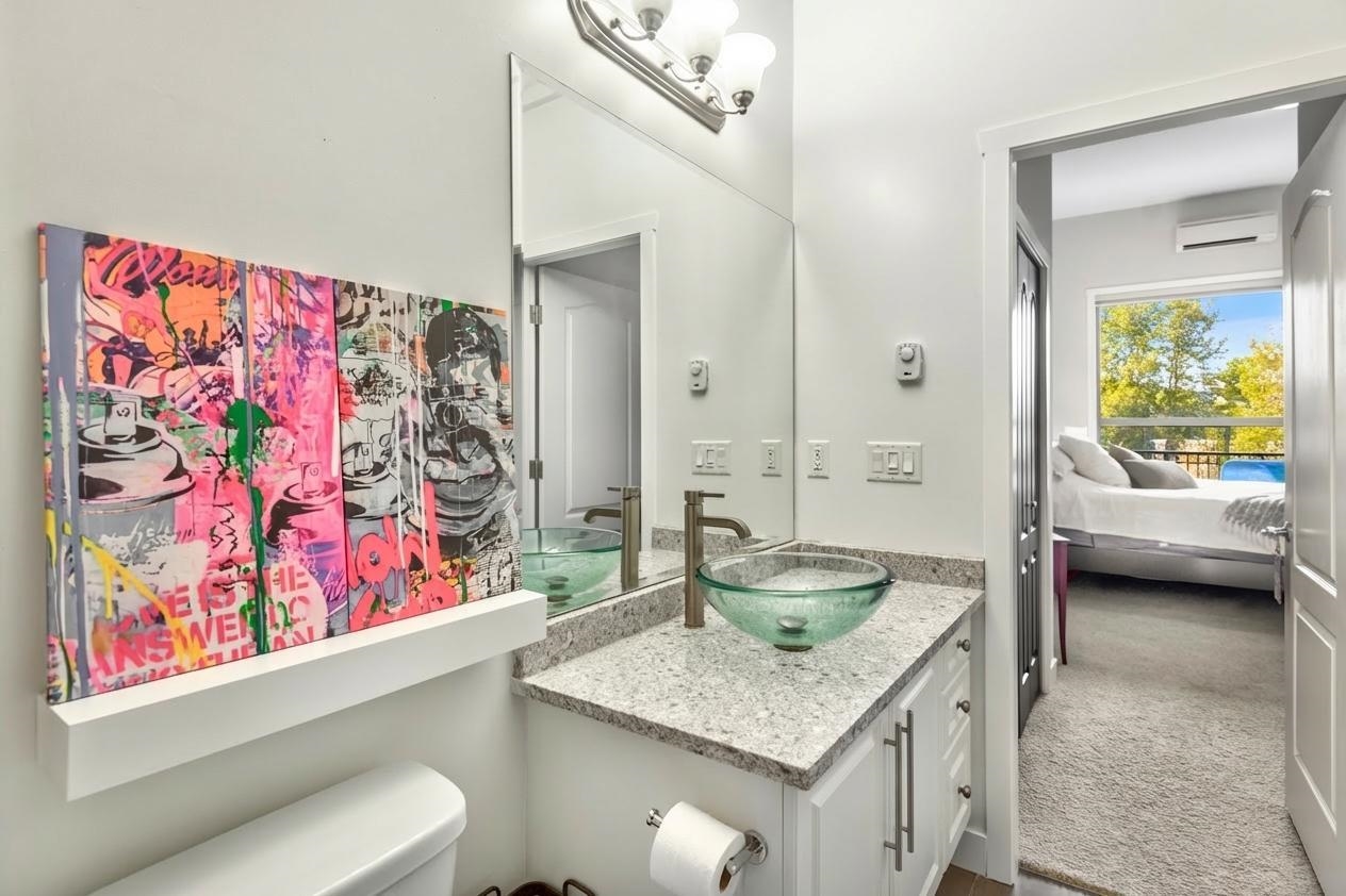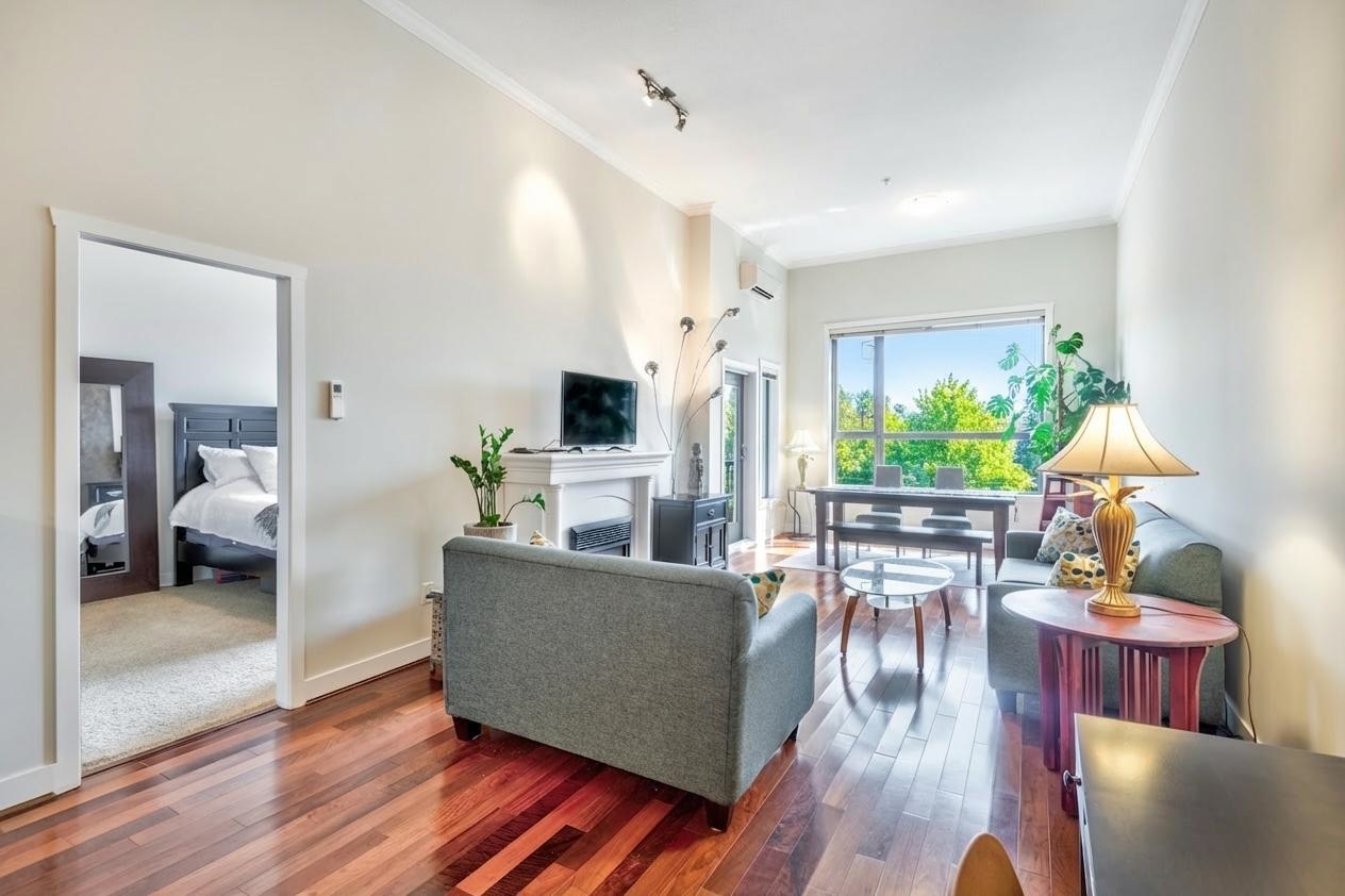 Welcome to Villagio 2 in the heart of PoCo! This top-floor 1 bed, 1 bath condo offers over 900 sqft of bright, open living w/ soaring 14’ ceilings, oversized windows & river views filling the space w/ natural light. Features Brazilian walnut hardwood, granite counters, wood cabinetry, S/S appliances, kitchen island & cozy fireplace. Stay comfortable year-round w/ A/C + in-suite laundry w/ extra storage. Enjoy your private balcony overlooking the river. Ideally located btwn parks & along the Coquitlam River, offering rare privacy while still urban. Bldg amenities incl gym & party/meeting rooms. Steps to Traboulay Trail, Gates Park, shops, cafés, restaurants, groceries & WC Express, w/ quick access to major routes & SkyTrain. 1 parking + storage. Rare riverside living! O/H Sat & Sun 2-4 pm.